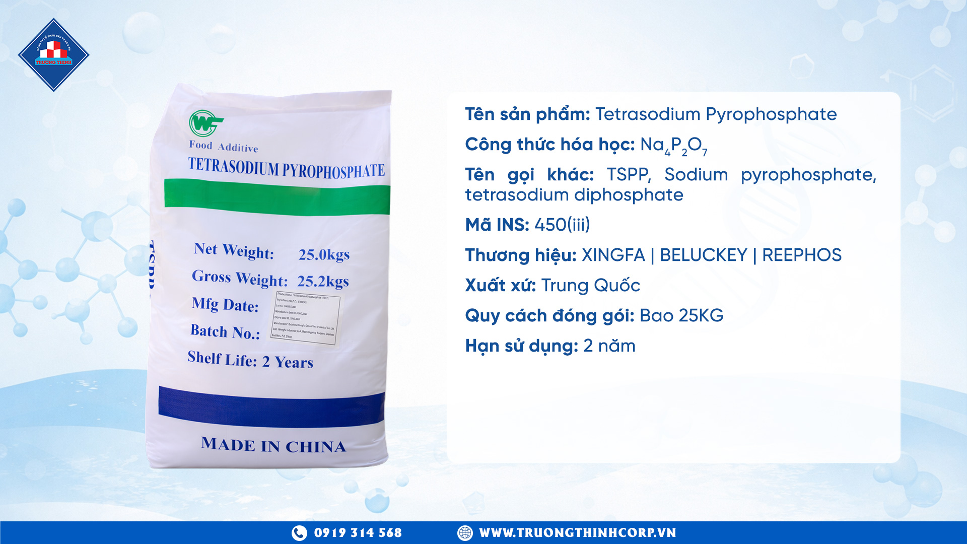 TSPP, tên đầy đủ là Tetrasodium Pyrophosphate (Na₄P₂O₇), là muối phosphate vô cơ mang mã số E-450i theo quy định phụ gia thực phẩm của EU. Cục quản lý thực phẩm Mỹ (FDA) xếp TSPP vào nhóm GRAS (Generally Recognized as Safe), tức là an toàn khi sử dụng đúng liều lượng trong sản xuất thực phẩm.