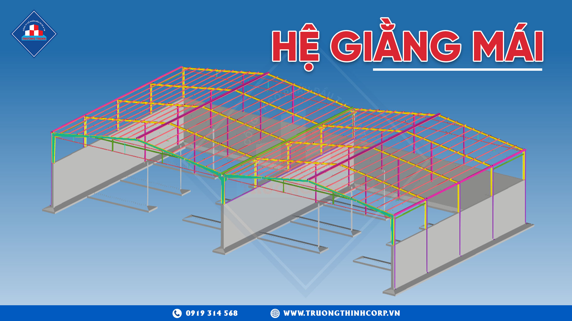 Hệ giằng mái là bộ phận chịu trách nhiệm ổn định khung theo phương ngang và đảm bảo mái nhà không bị xoắn vặn dưới tác động của tải trọng gió hoặc nhiệt.