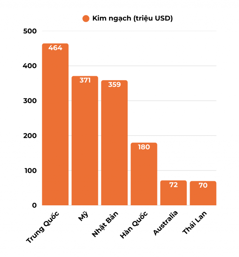 - Trung Quốc: 464 triệu USD (+74%), dẫn đầu.